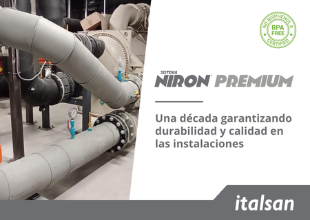 Fabricado con polipropileno PP-RCT de altas prestaciones y 100 % certificado por organismos de reconocido prestigio como AENOR, NSF y ASTM, NIRON Premium está diseñado para ofrecer una elevada resistencia térmica y mecánica, manteniendo su rendimiento intacto a lo largo del tiempo incluso en entornos donde la durabilidad del material es un factor crítico.